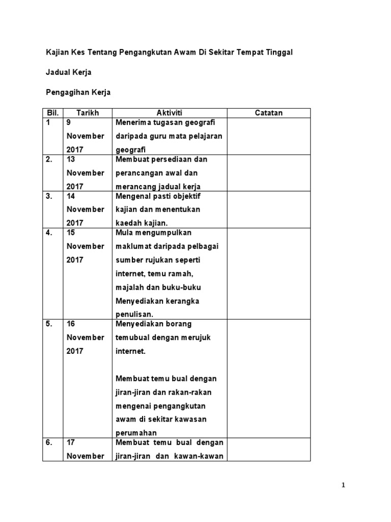 - Menerima taklimat daripada guru berkaitan dengan tajuk tugasan panduan rubrik pelaksanaan kajian. Meninjau dan memerhati jenis kenderaan yang terlibat. Contoh 1 Jadual Kerja Tugasan Geografi PT3.